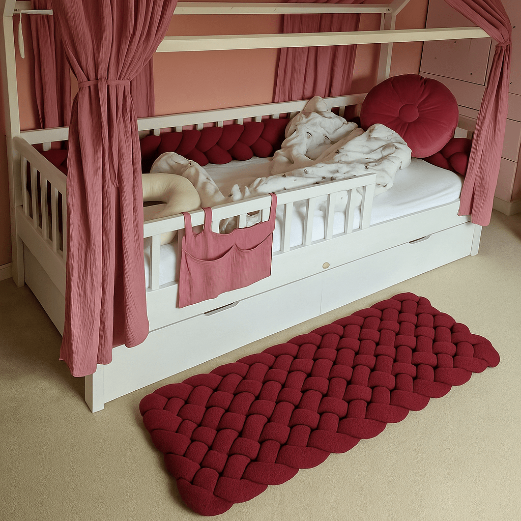 Jedes Stück wird in liebevoller Handarbeit in unserem Atelier in Unterfranken gefertigt. Das weiche, voluminöse Flechtdesign sorgt für ein unvergleichlich angenehmes Laufgefühl und ist zugleich ein echter Blickfang. Der Teppich eignet sich ideal vor dem Kinderbett, im Spielbereich oder als dekoratives Element im Familienraum.