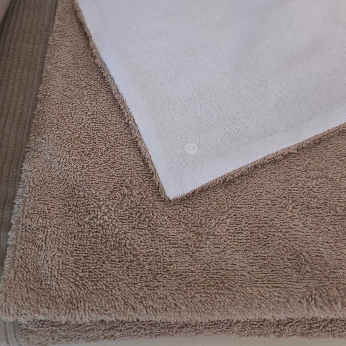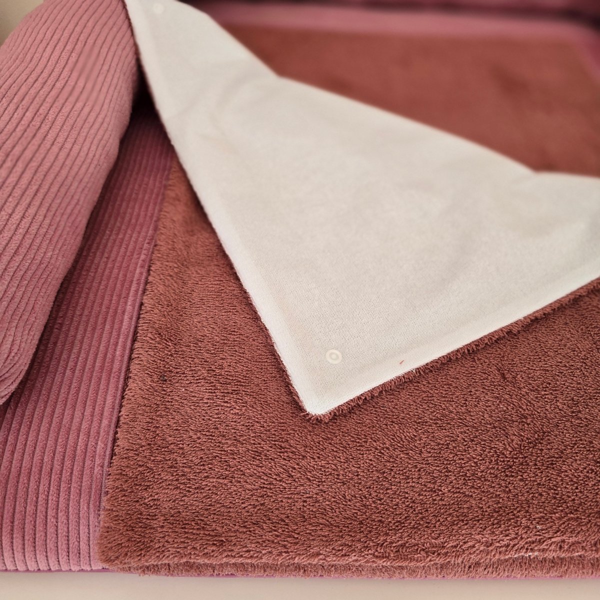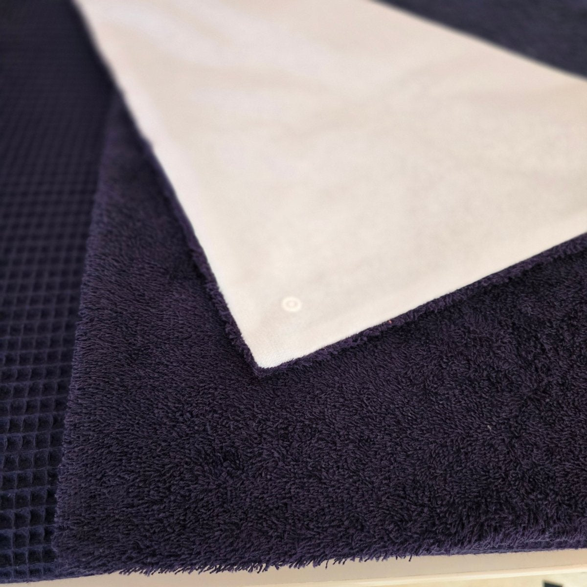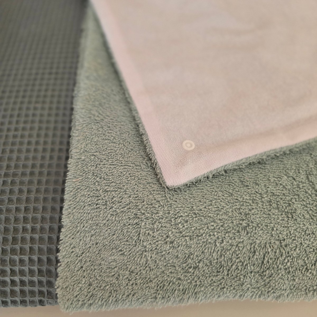 Die abknöpfbare Auflage ist wasserdicht und wird aus Frottee oder wasserfestem Stoff genäht. Die Druckknöpfe werden automatisch an die Wickelunterlage/Bezug angebracht, wenn man die abknöpfbare Auflage dazu bestellt.