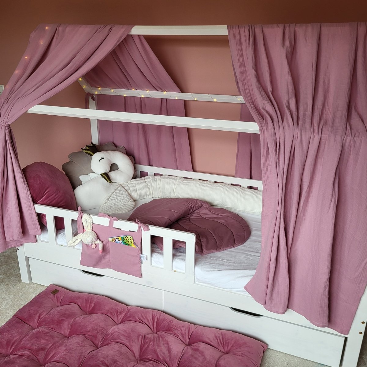 Der Organizer wird mit Hilfe von Schleifen einfach an das Bett aufgehangen.