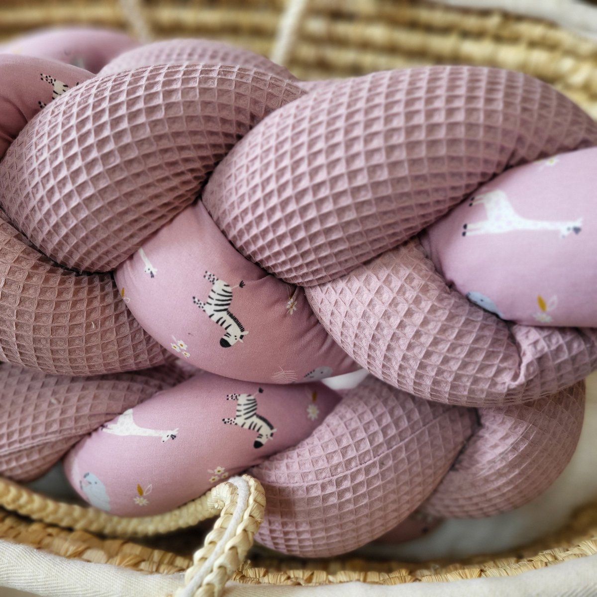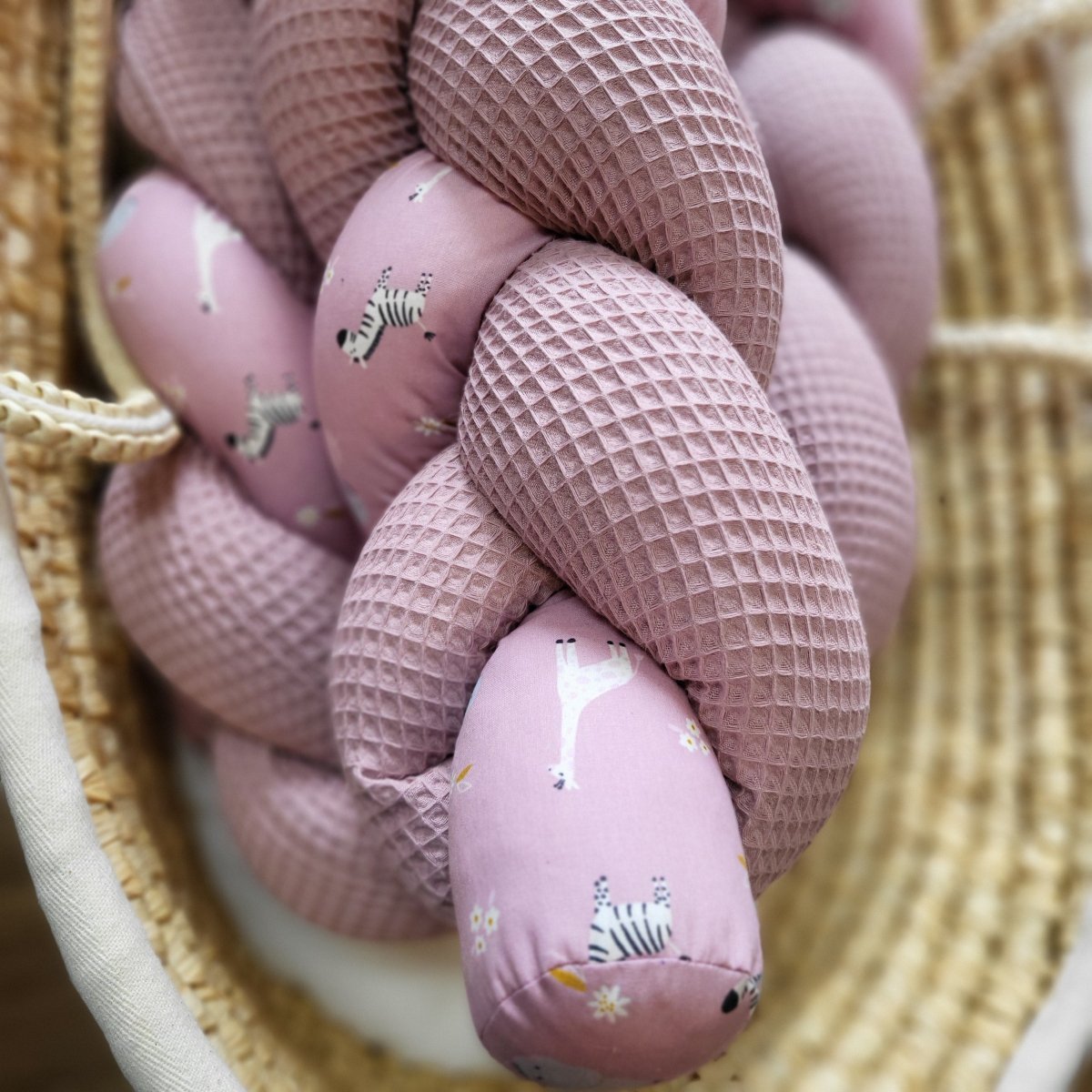 Unsere Bettschlange aus Waffelpiqué und bedruckter Baumwolle wird mit viel Liebe in Deutschland gefertigt. Jede Bettschlange ist ein Einzelstück und schützt dein Baby zuverlässig vor harten Gitterstäben. Die Kombination aus Strukturstoff und süßen Motiven bringt Wärme und fröhliche Farbakzente ins Kinderzimmer.