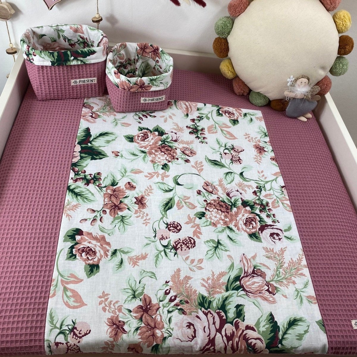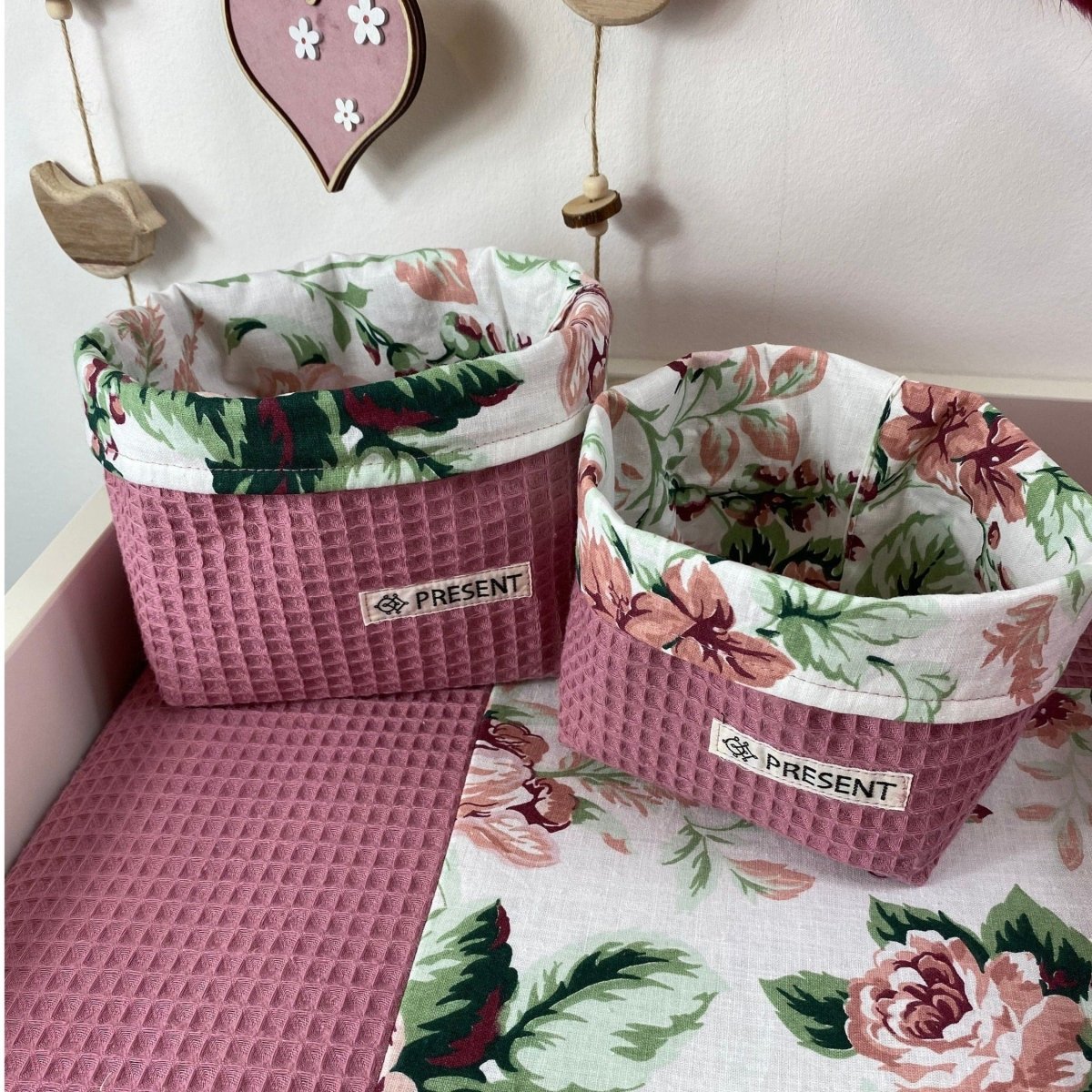 Dieses praktische Utensilo aus Waffelpiquè und Baumwolldruck als optimale Ergänzung für deinen Wickeltisch. Zur Aufbewahrung von Windeln, Feuchttüchern, Cremes, Mulltüchern, Haarbürste und anderen Accessoires auf dem Wickeltisch. Die Körbchen werden mit Vlieseline verstärkt welches für eine gute Standfestigkeit sorgt.