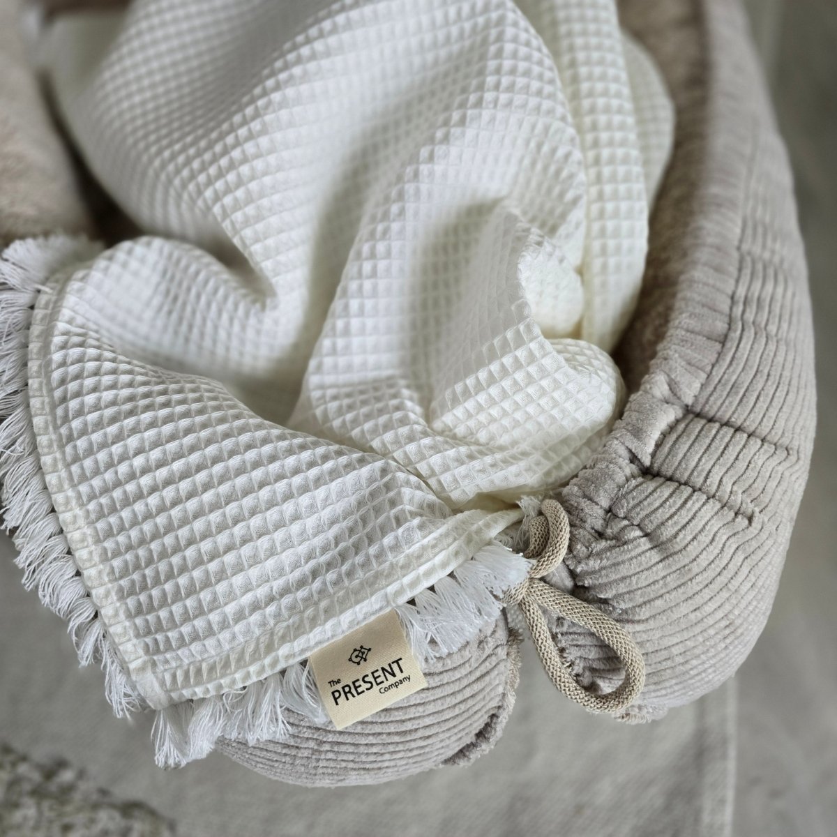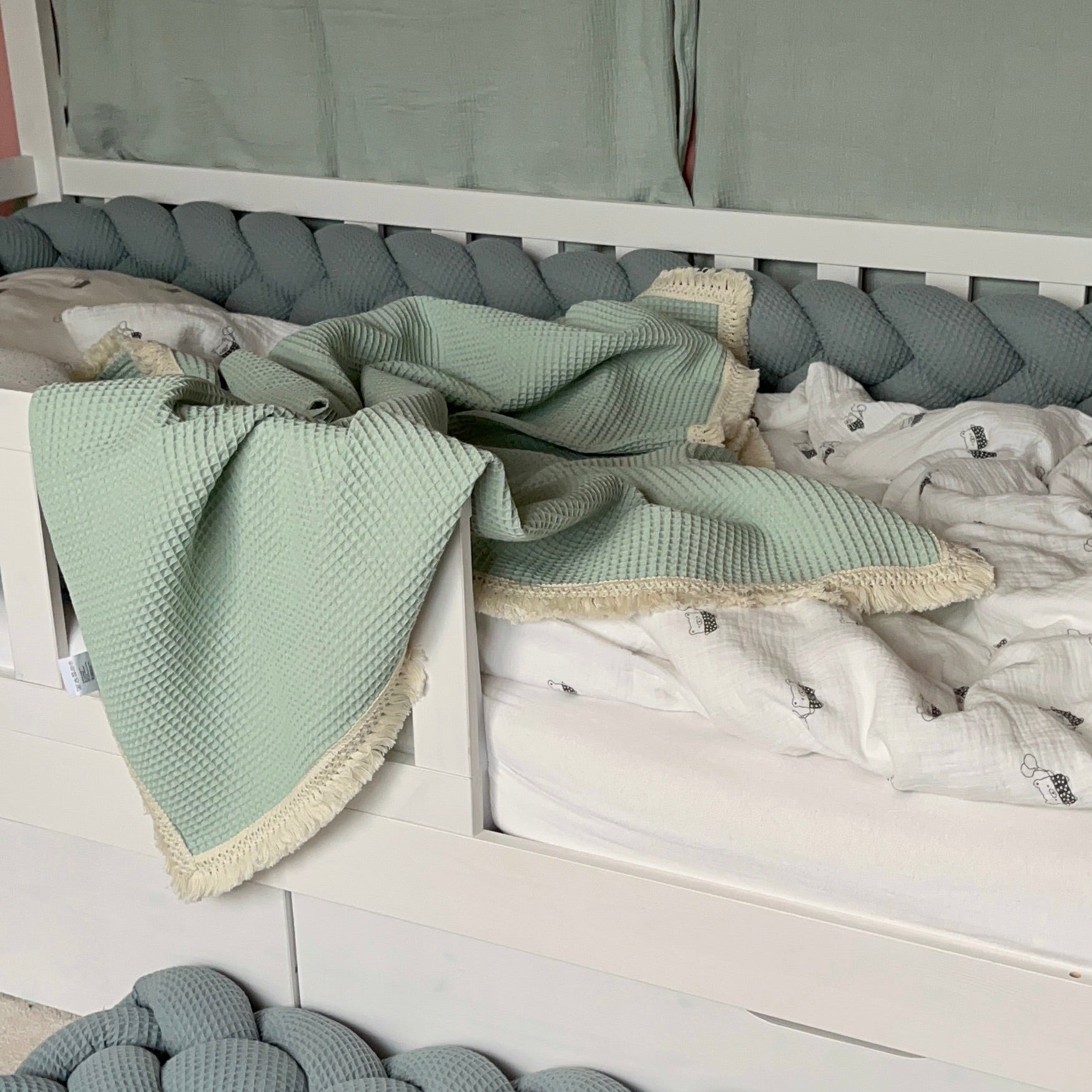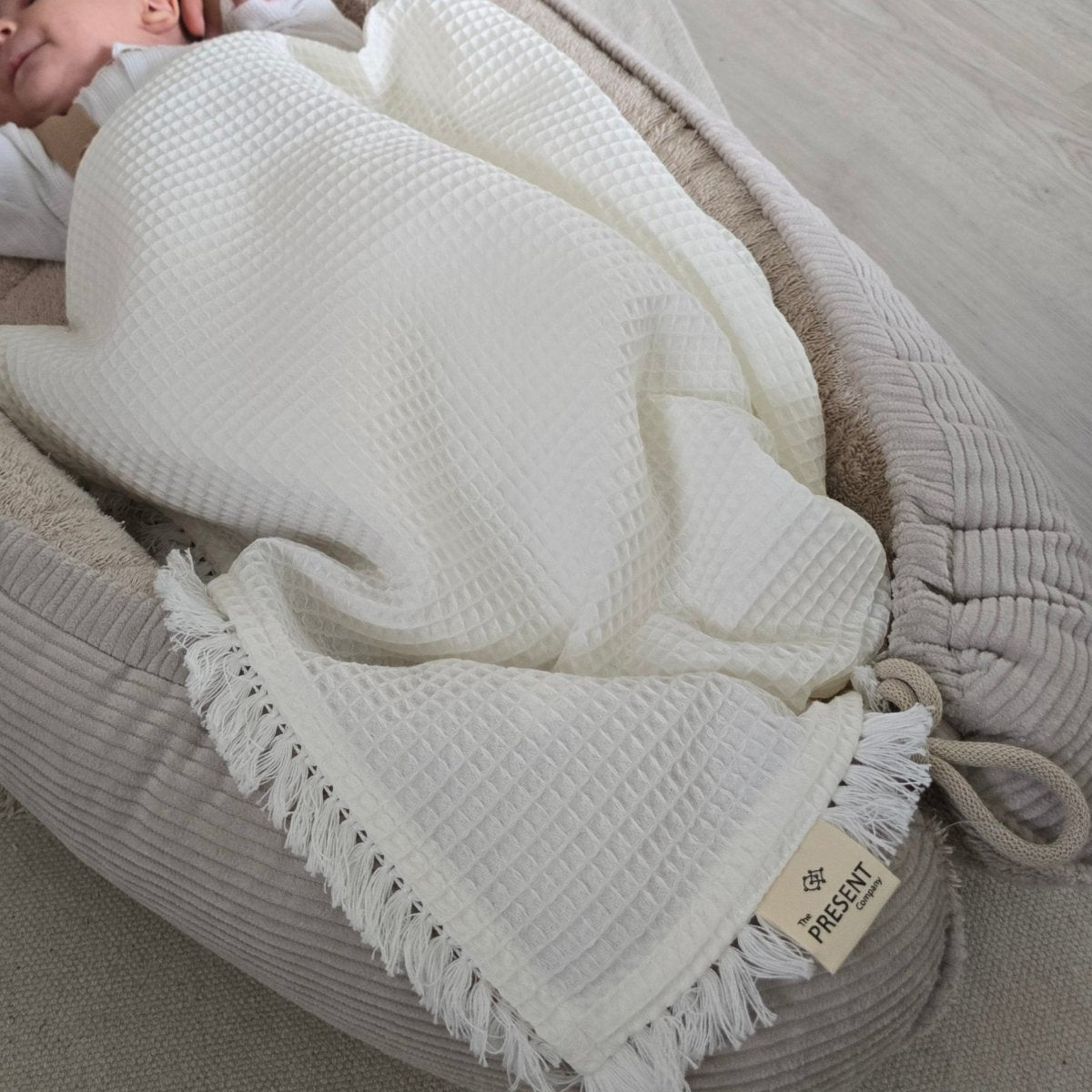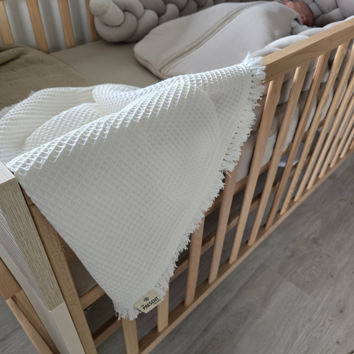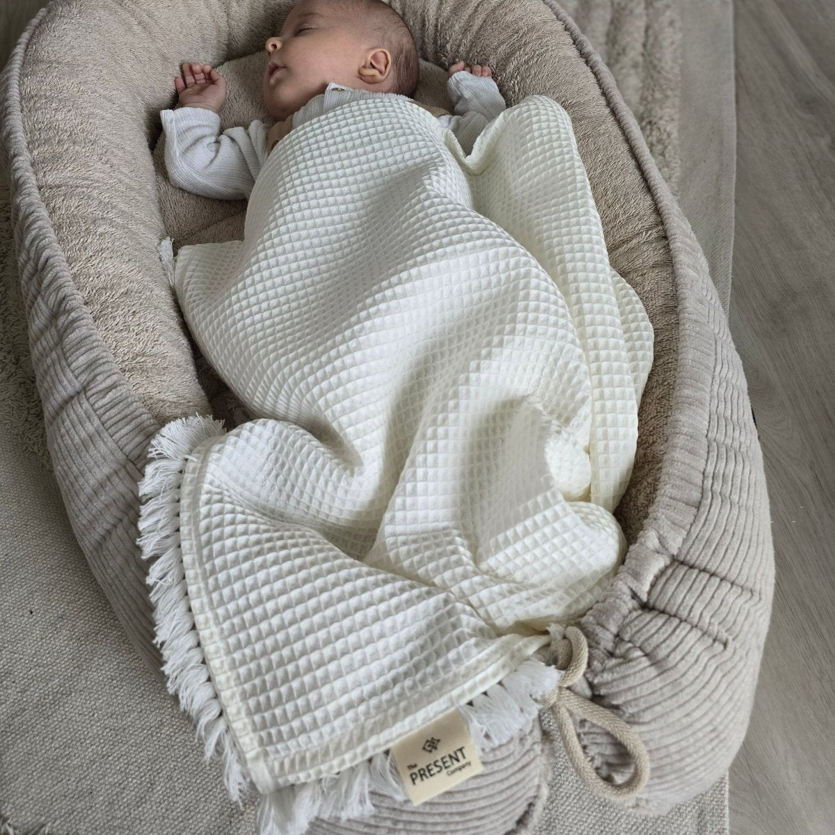 Unsere Babydecken sind aus hochwertiger, reiner Baumwolle gefertigt und bieten ein raffiniertes Waffelstrickmuster. Das maschinenwaschbare Material sorgt für eine einfache Pflege, während die reine Baumwolle ein herrlich weiches Gefühl auf der zarten Haut deines Babys vermittelt.