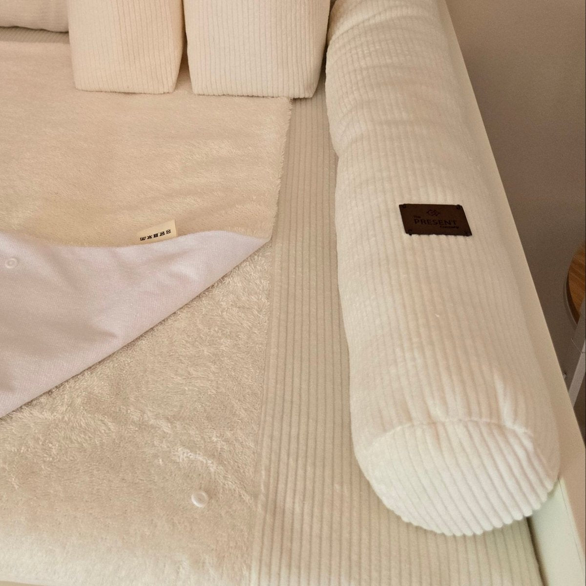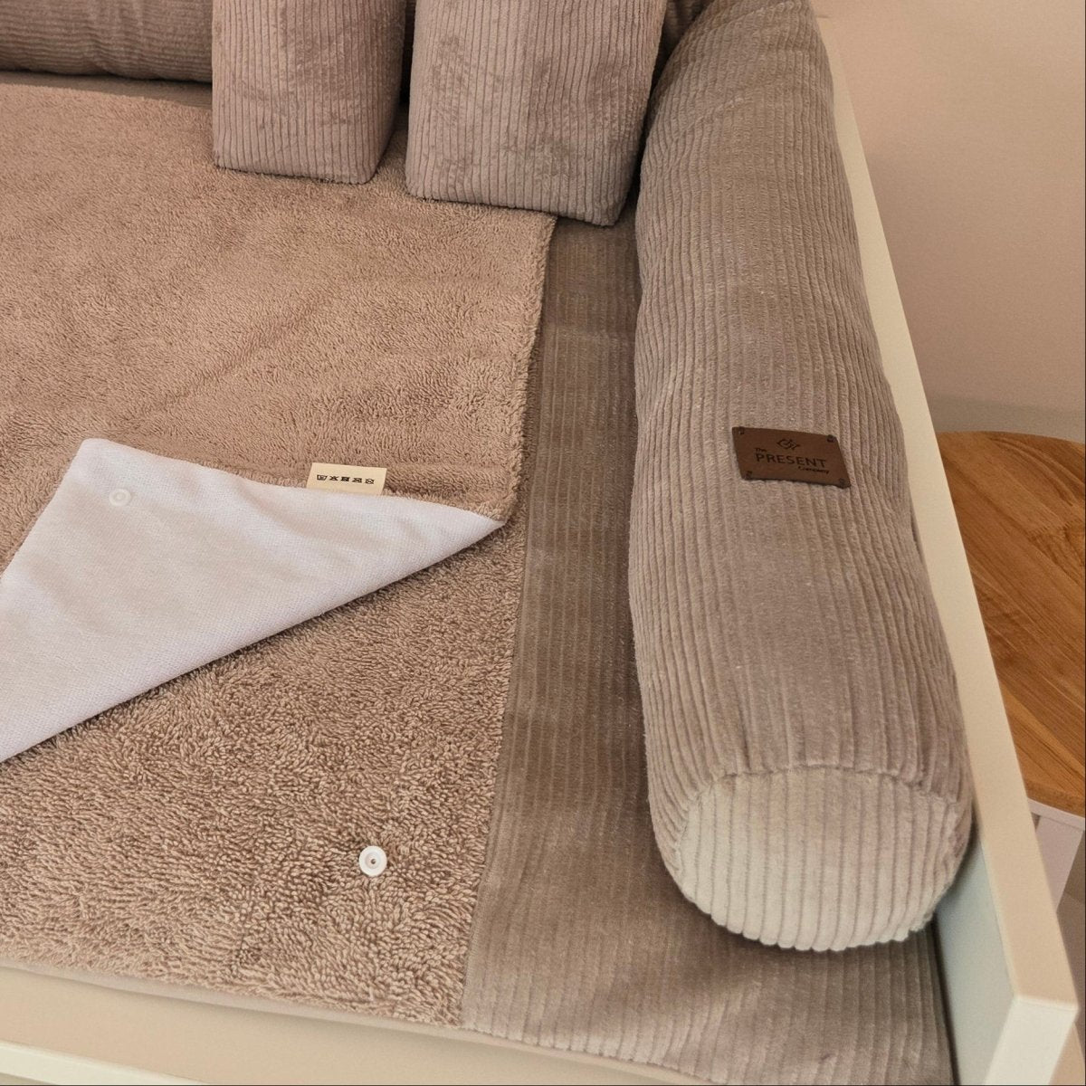Bei dieser Variante kannst du den Bezug mit einem Reißverschluss leicht abziehen und den Bezug in der Waschmaschine waschen, wenn der schmutzig wird. Dadurch kannst du das Inlay/ Matratze schonen. So bleibt die Matratze länger stabil und in Form. Die innenliegende wasserfeste Matratze kann man mit einem feuchten Tuch sauber wischen.